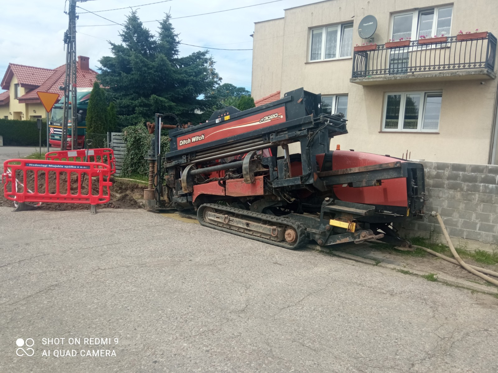 To zdjęcie przedstawia czerwono-czarną maszynę gąsienicową, która jest wiertnicą horyzontalną do wykonywania przewiertów sterowanych pod ziemią. Maszyna stoi na utwardzonym poboczu.