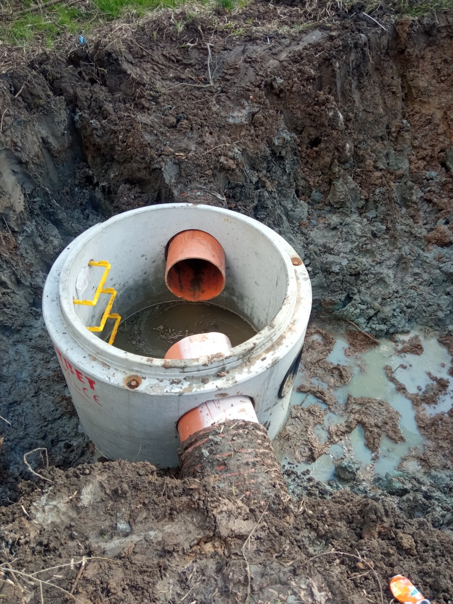 Betonowa studnia z pomarańczowymi rurami znajduje się w głębokim, błotnistym wykopie.