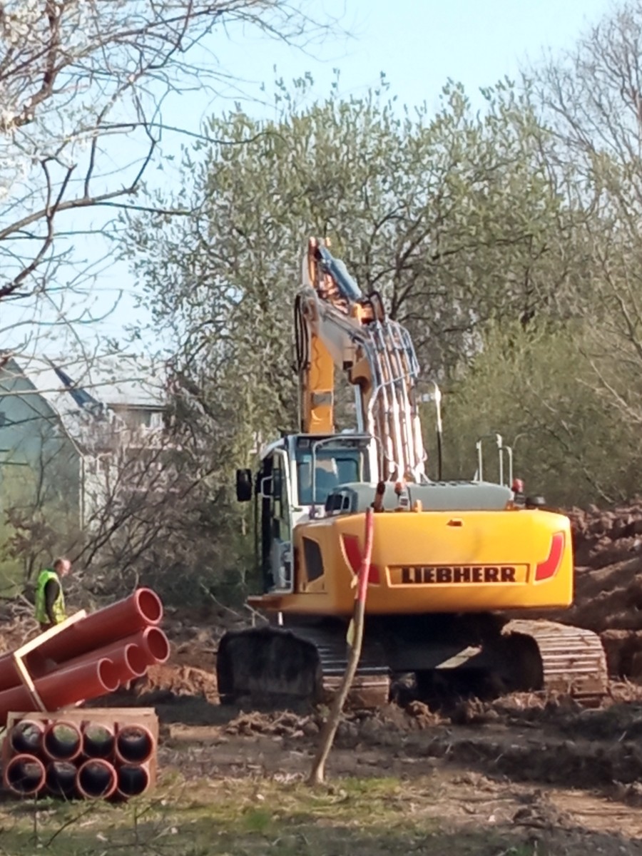 Duża, żółta koparka stoi na błotnistym terenie budowy, otoczonym zielonymi drzewami. Na pierwszym planie widoczne są stosy pomarańczowych rur kanalizacyjnych, a obok stoi pracownik.