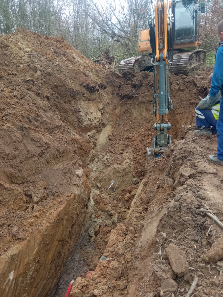 Wąski i głęboki wykop ziemny biegnie przez plac budowy w kierunku żółtej koparki znajdującej się w tle.