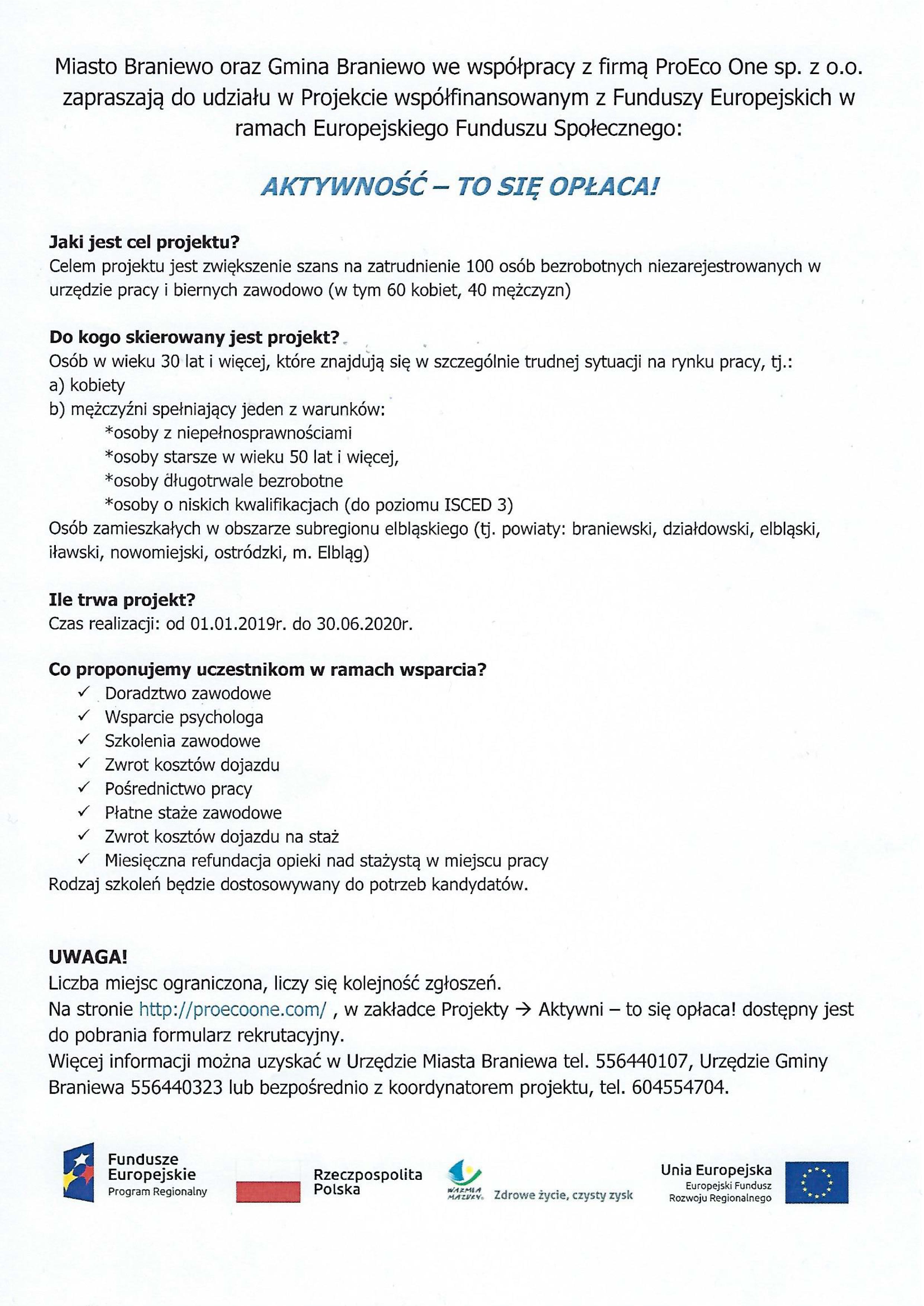 Miasto Braniewo oraz Gmina Braniewo we współpracy z firmą ProEco One sp. z o.o. zapraszają do udziału w Projekcie współfinansowanym z Funduszy Europejskich w ramach Europejskiego Funduszu Społecznego.