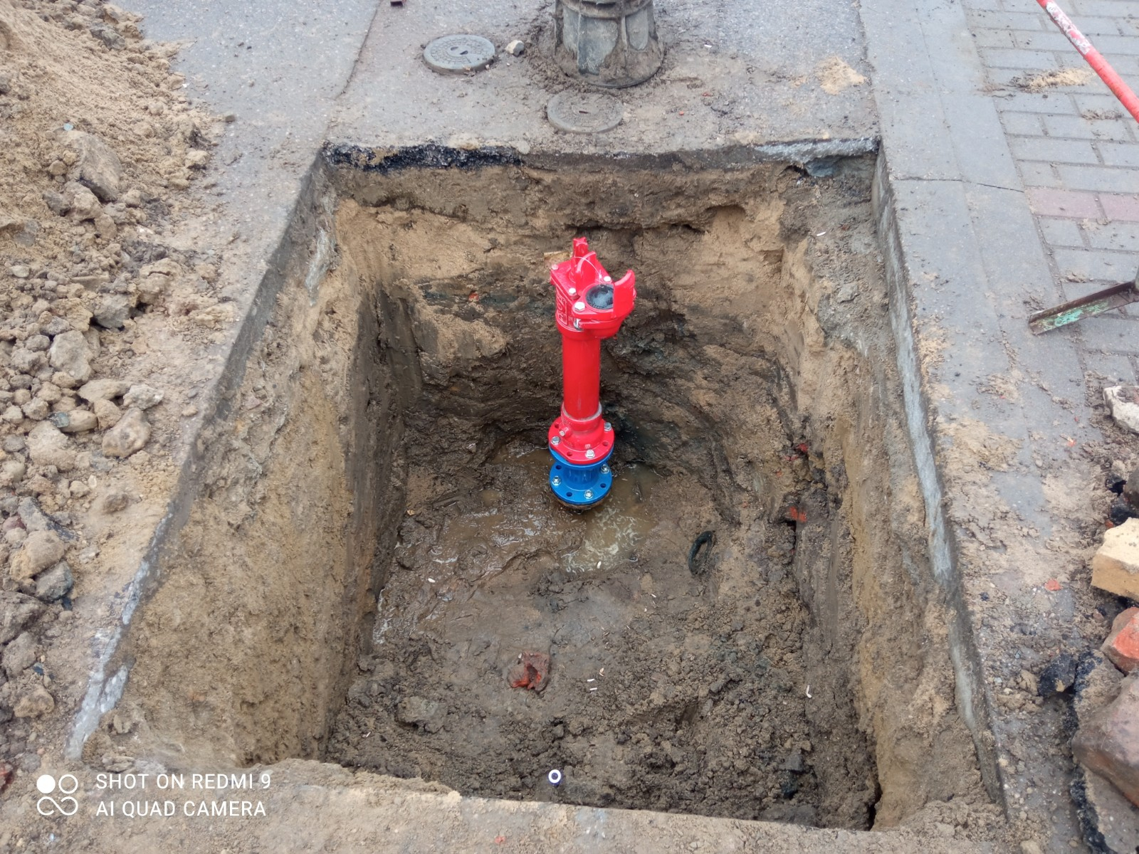 Zdjęcie przedstawia duży, kwadratowy wykop w ziemi, otoczony luźną glebą i fragmentami chodnika. W centralnej części wykopu zainstalowany jest nowy, czerwony hydrant z niebieską podstawą.