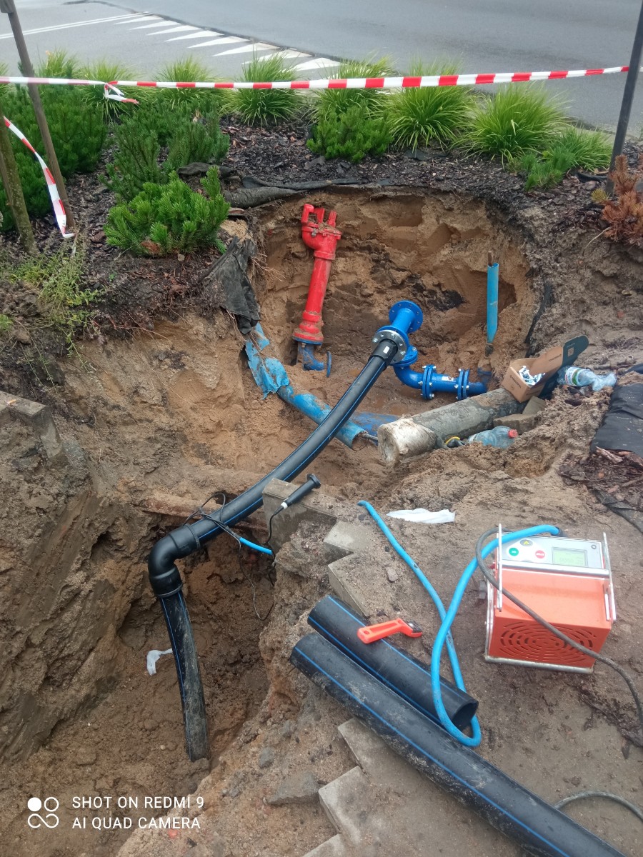 Zdjęcie przedstawia wykop ziemny, w którym trwa montaż. Widoczne są rury: czerwony hydrant nadziemny i niebieskie elementy armatury, w tym zasuwy kołnierzowe, połączone z czarnymi rurami.