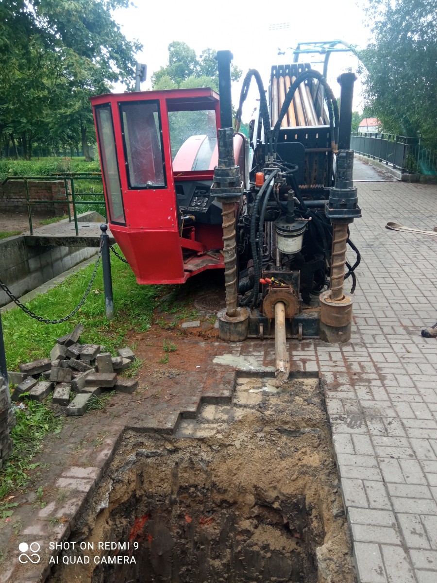 To zdjęcie przedstawia czerwoną wiertnicę do wykonywania bezwykopowego przewiertu, który umożliwi instalację nowego wodociągu. Maszyna, stoi na kostce brukowej, z osprzętem.