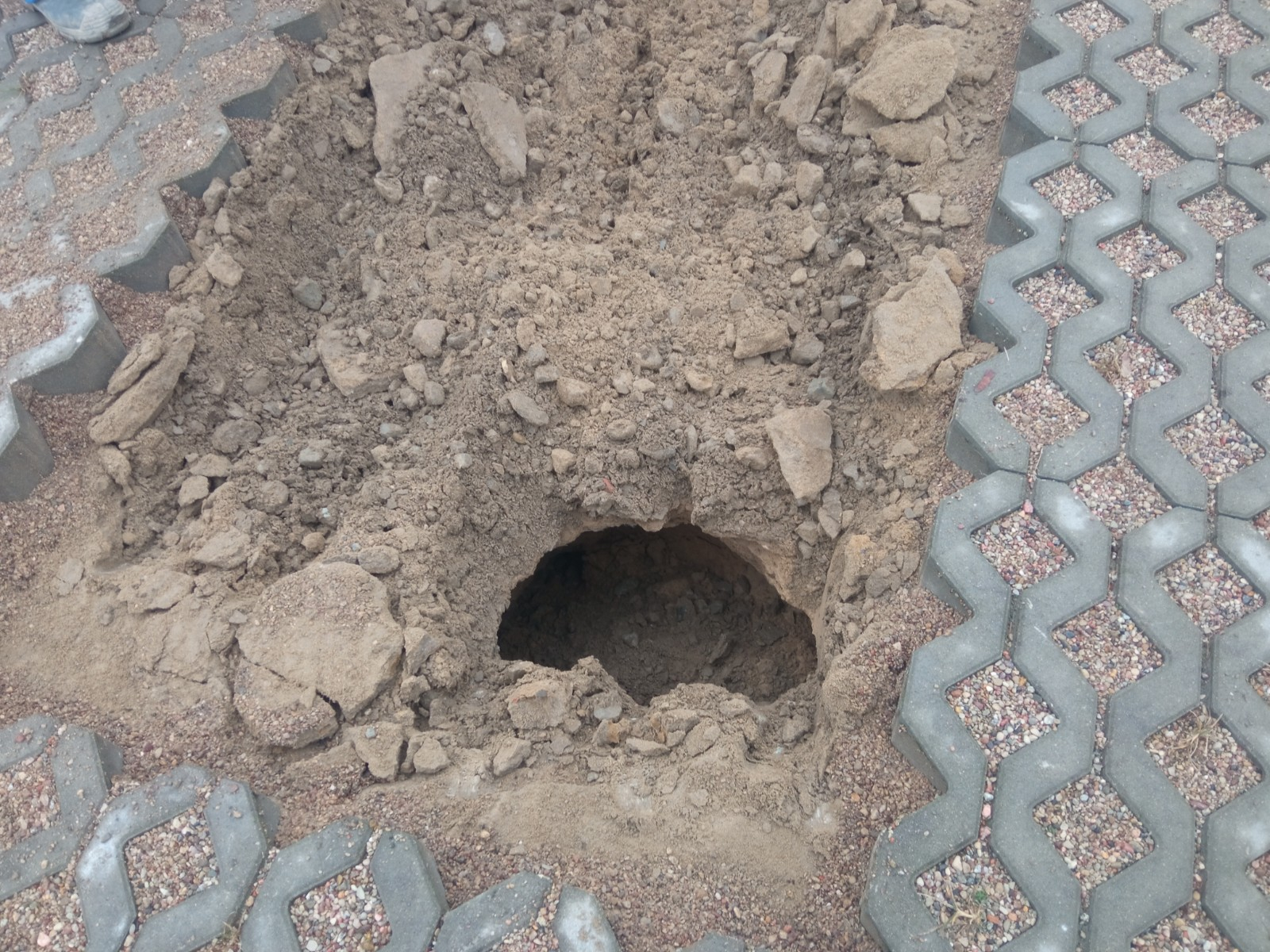 Głębokie zapadlisko z luźną ziemią i kamieniami widoczne w nawierzchni z kostki brukowej to wynik awarii wodociągu.
