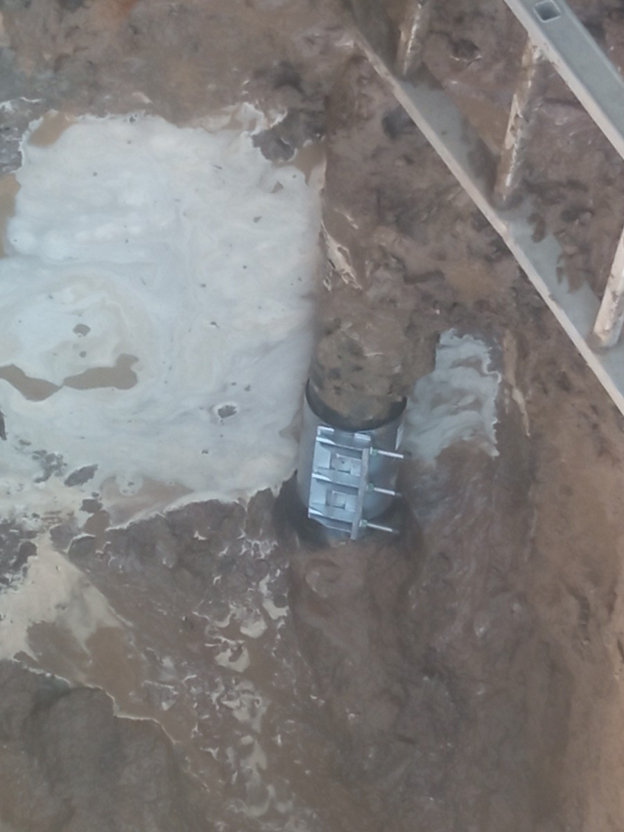 Metalowa opaska naprawcza jest szczelnie zamontowana na skorodowanej rurze żeliwnej, znajdującej się w wykopie ziemnym wypełnionym błotnistą wodą.